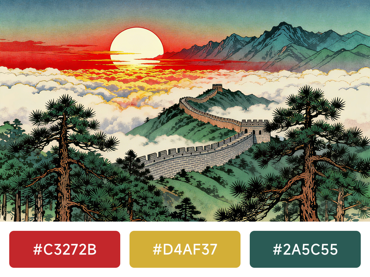主色:朱砂红(#C3272B),如朝阳初升,炽热而庄重。