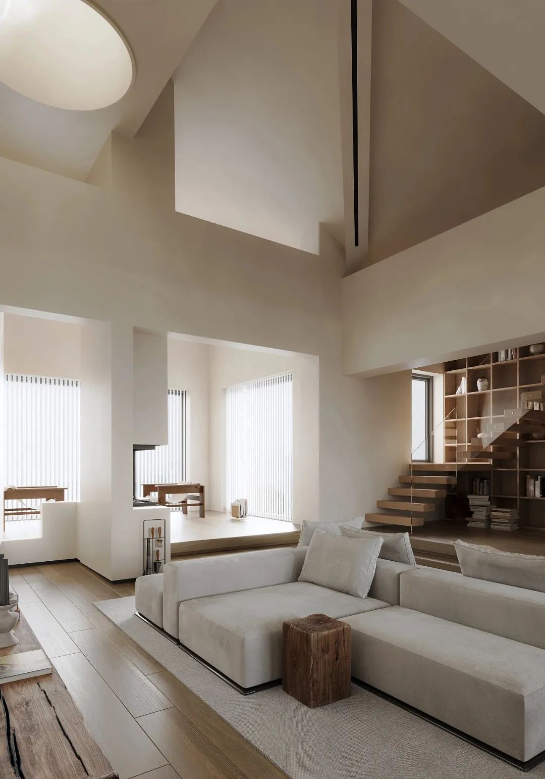为了避免大面积的白色给人疏离感,适当的在局部点缀其它色彩(如绿植),来平衡视觉感,能有效的营造出空灵明朗之感。