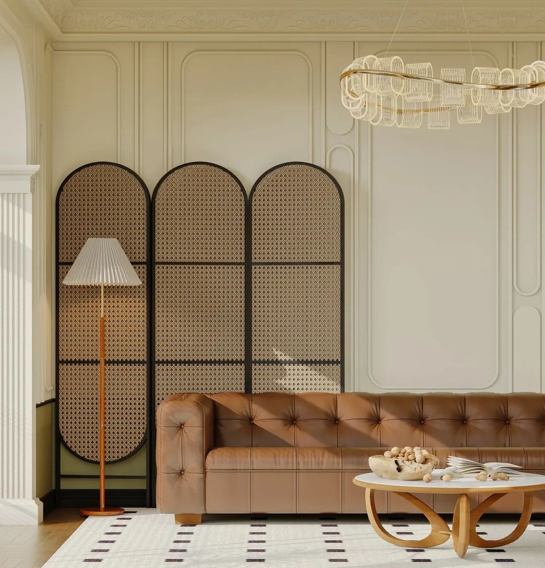 木质板、藤编、绿植等自然元素构成了南洋复古风中主要的建筑特色,通常在桌椅、柜体、隔断等元素上展现,勾勒渲染出极具海岛风情的静谧空间;其中还会适当融入欧式风格的审美,如一些金属质地的灯具、装饰、家具等配件,整体表现得精致又复古。