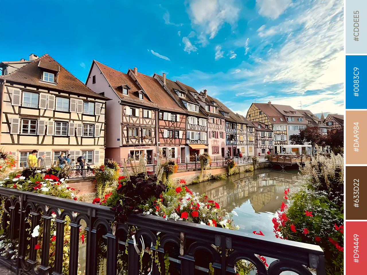 法国小镇的色彩搭配充满浪漫与情怀。以浅灰色为基调,配以砖红色、深蓝色和金色,如同一块浓墨重彩的油画画布,正在为人们展示着一个个浪漫的故事,让人情不自禁沉醉其中。