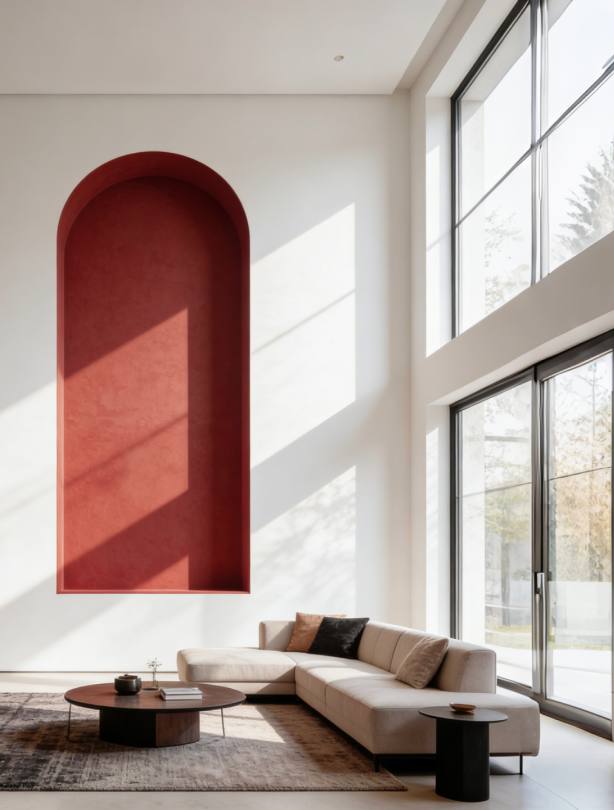 在极简或现代风格的空间中,可以将其用作局部的墙体肌理或色彩模块。例如,在白色墙面中嵌入一个Burnt Sienna赤褐赭色的壁龛或储物模块;或用于走廊的端景墙,创造深远的视觉吸引力。它也能与天然木材结合,作为护墙板的色彩,增强空间的连贯性与温暖质感。