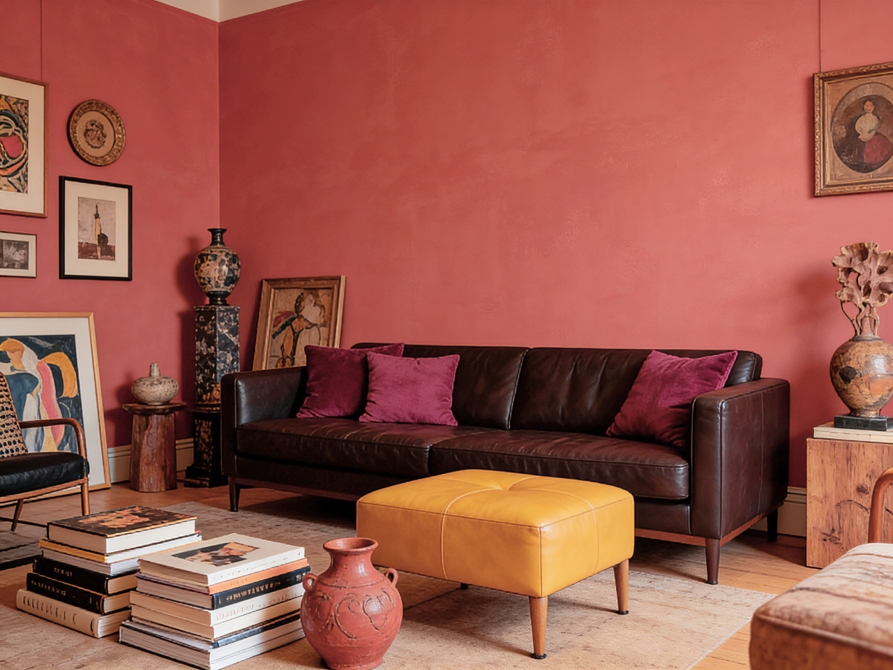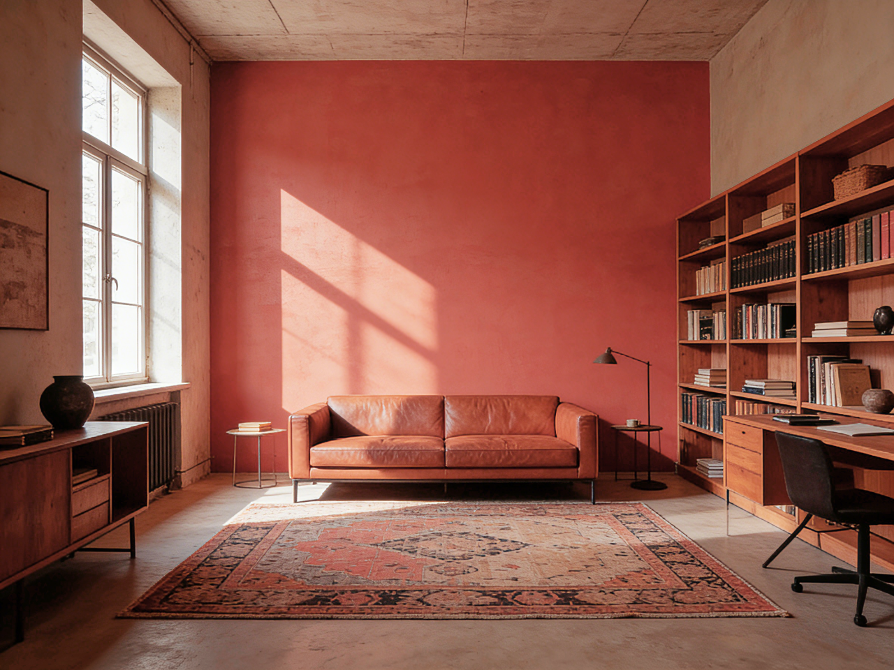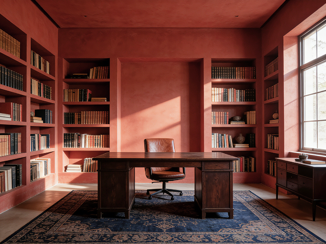 在书房、工作室、图书馆或卧室,四面墙通刷Burnt Sienna赤褐赭色,能营造出一个极具沉思氛围和安全感的环境。这种用法如同为房间构筑了一个夯土基座,包裹感极强,能有效收拢视线,让人专注于当下。选择带有天然矿物肌理或细腻批刮痕迹的艺术涂料,能强化墙面的手作感与自然气息,让色彩仿佛从土地中生长出来一般真实。