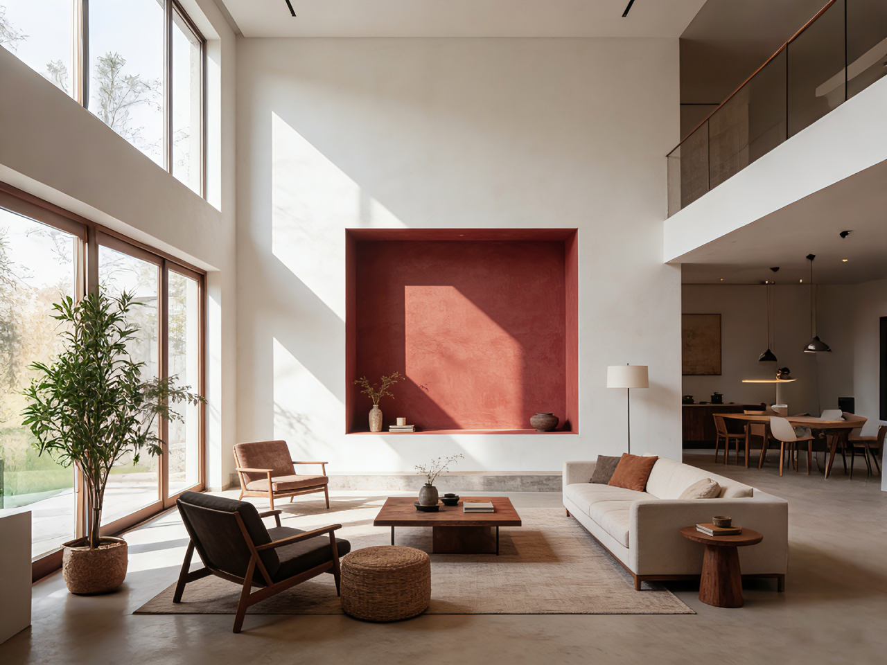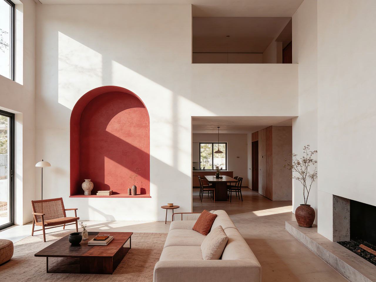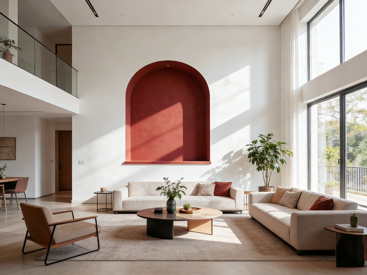 效果:强烈的明暗对比让空间结构清晰,Burnt Sienna赤褐赭的温暖质感被极致烘托,整体氛围明亮、现代、温馨且充满高级的戏剧感。