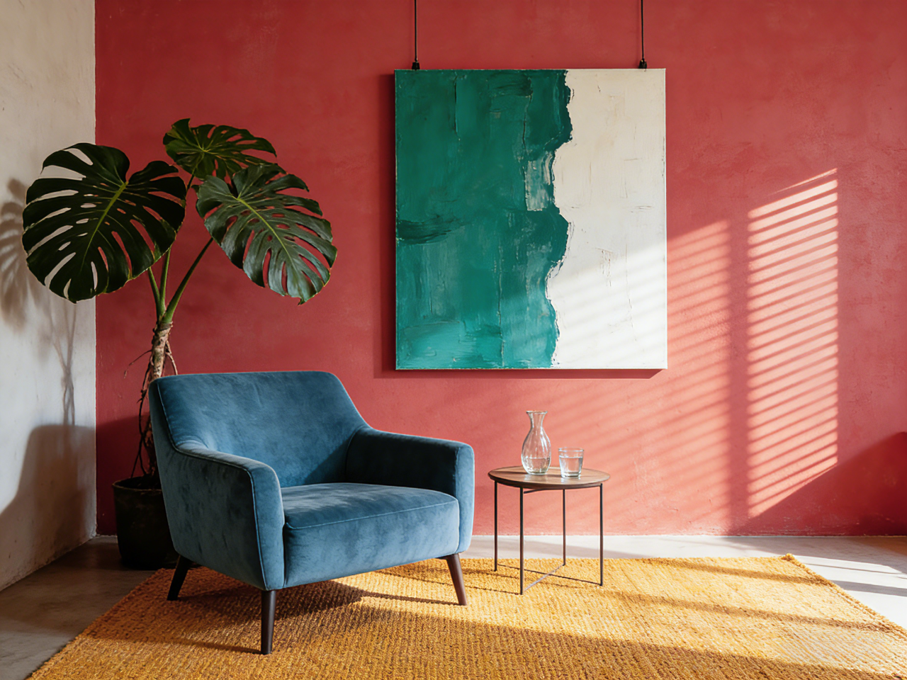 实践:Burnt Sienna赤褐赭色墙面,搭配一张深海蓝色的丝绒单人椅,或悬挂一幅以大面积的翠玉绿和白色为主的抽象画。大量引入绿植。