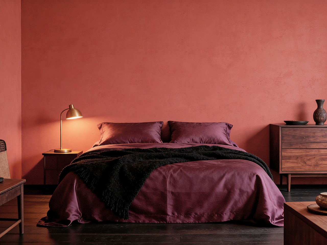 实践:Burnt Sienna赤褐赭色卧室墙面,搭配烟熏紫色的高支棉缎面床品、炭黑色的羊毛盖毯,以及深色胡桃木家具。灯光设计需层次丰富。