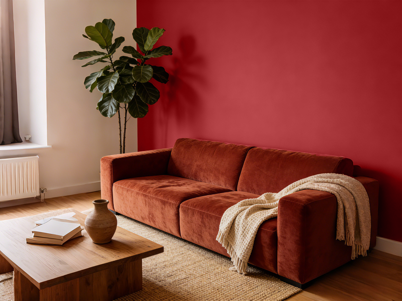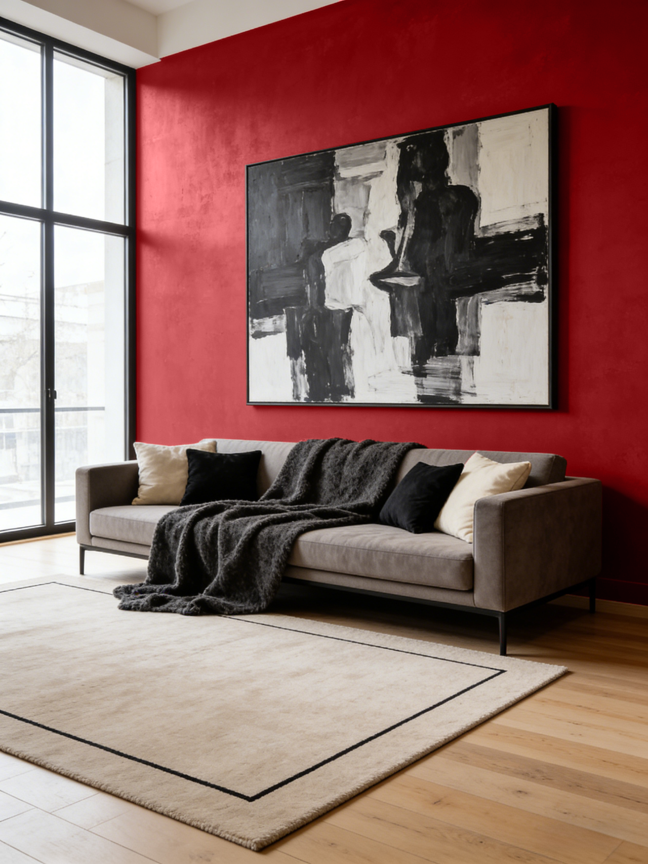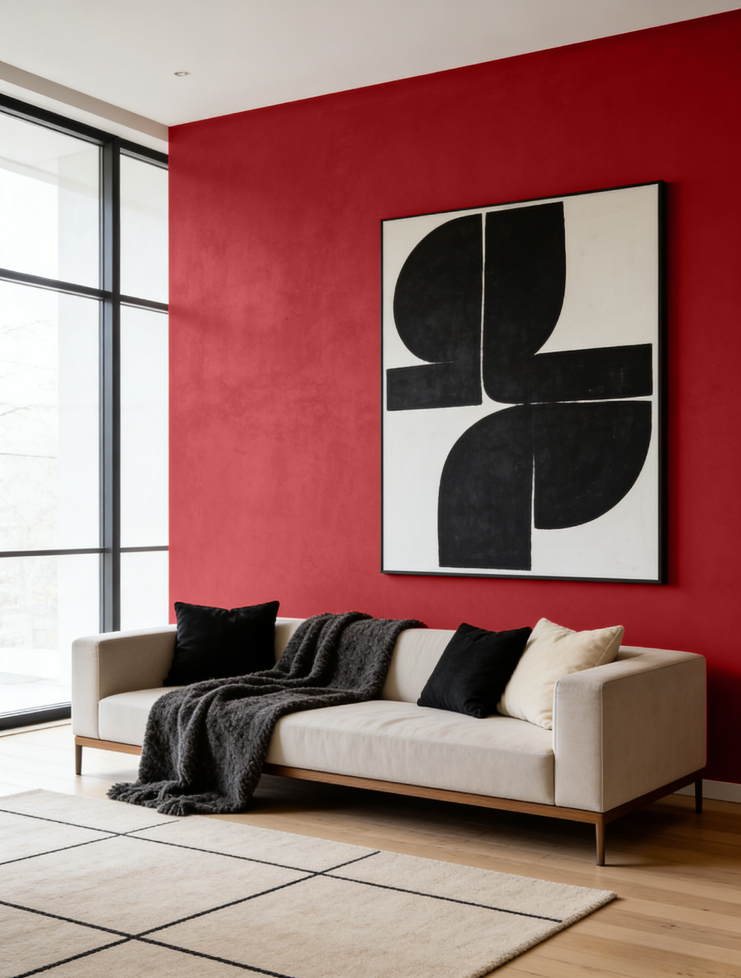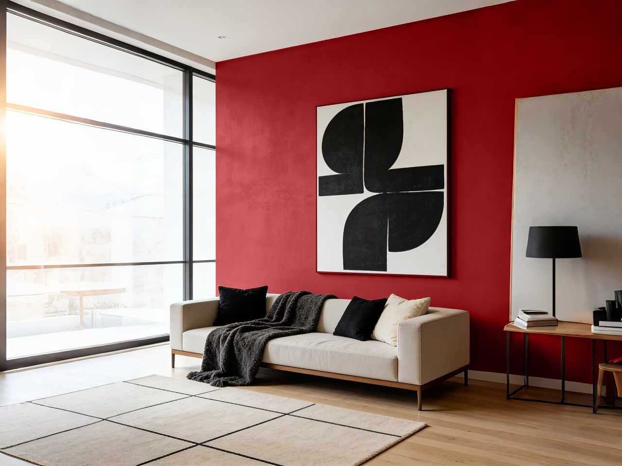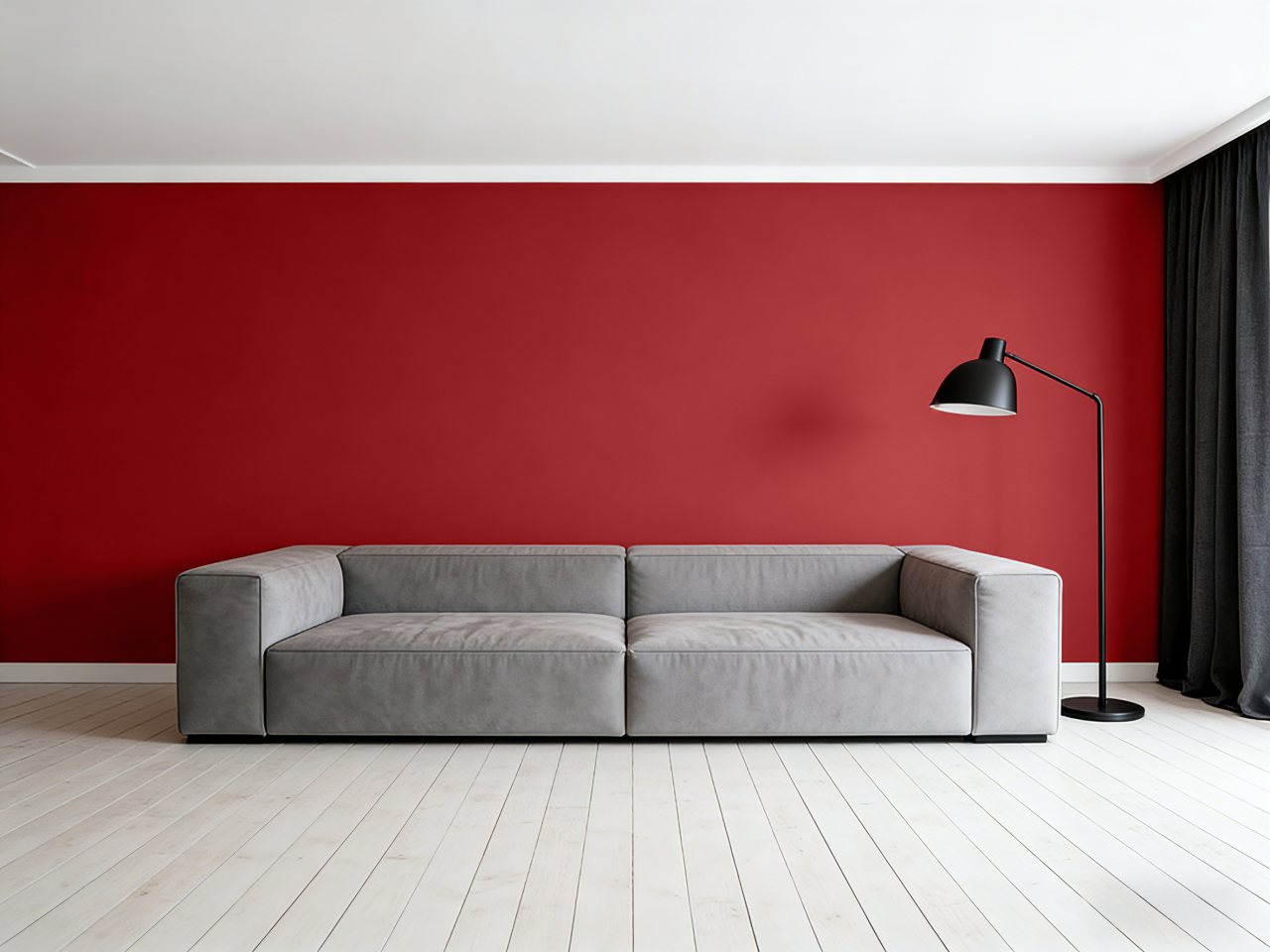 实践:熔岩红焦点墙,搭配纯白色天花板、浅灰色超长沙发、黑色哑光金属落地灯和深灰色窗帘。地面选择浅色木地板或中灰色微水泥。