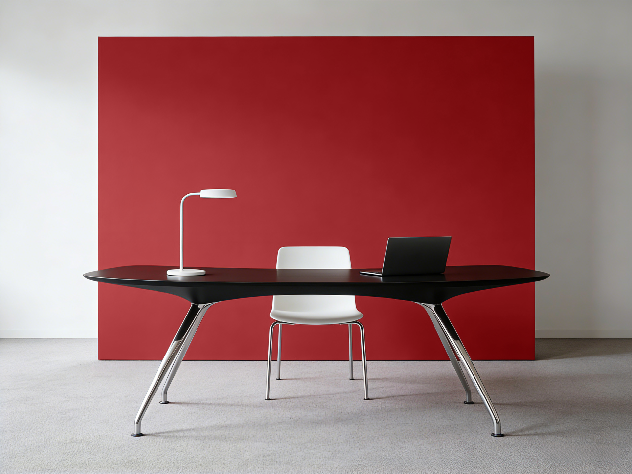 效果:中性色如同安静的舞台,让熔岩红成为唯一的主角。空间显得极端现代、干净利落,红色的能量被纯粹地释放,极具画廊般的时尚感。